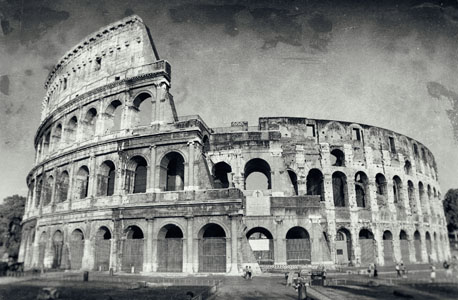 Weather worn columns of a the Temple to Emperer Hadrian in the Piazza Di Pietra, Rome in Black & White